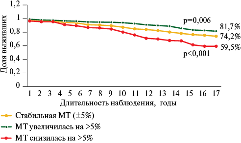 Анализ 17-летней выживаемости в зависимости от направленности динамики МТ продемонстрировал более высокие показатели (81,7%) в группе лиц, чья МТ увеличилась в предшествующий период более, чем на 5%. У лиц со стабильной МТ уровень 17-летней выживаемости составил 74,2% (p=0,006). Снижение МТ на >5% уменьшало шансы остаться в живых через 17 лет наблюдения до 59,5% (p<0,001) (рисунок 1).
