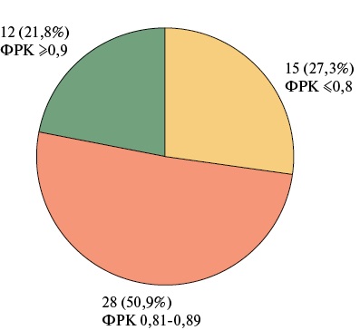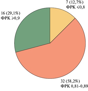 Результаты. При оценке результата стентирования с помощью физиологического индекса установлено, что в 15 (27,3%) случаях стентирование не привело к устранению ишемии, а достичь оптимальных показателей ФРК удалось только у 12 (21,8%) пациентов. Оптимизация результатов ЧКВ потребовалась 17 (30,9%) пациентам. После выполнения оптимизации у 7 (12,7%) пациентов сохранялась резидуальная ишемия, у 32 (58,2%) пациентов достичь оптимальных показателей физиологического индекса не удалось и только у 16 (29,1%) человек был получен оптимальный показатель ФРК.