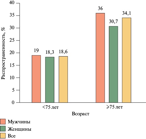 На рисунке 1 представлена распространенность высокого уровня стресса в зависимости от пола и возраста. Обнаружено, что среди участников среднего и пожилого возраста (<75 лет) 18,6% лиц испытывают высокий уровень стресса, в то время как среди лиц старческого возраста (≥75 лет) — 34,1%. Для мужчин ≥75 лет распространенность стресса значимо выше в сравнении с женщинами (p<0,001). В таблице 1 представлена распространенность различных ФР и заболеваний в зависимости от уровня стресса. У мужчин старше трудоспособного возраста со средним или ниже среднего уровнем образования, низким уровнем доходов, с ИМ и ОНМК в анамнезе частота высокого уровня стресса была достоверно выше. У женщин старше трудоспособного возраста распространенность данного показателя была выше при наличии низкого уровня доходов, работы, сопряженной с физическим трудом, и в случае наличия ОНМК в анамнезе.
