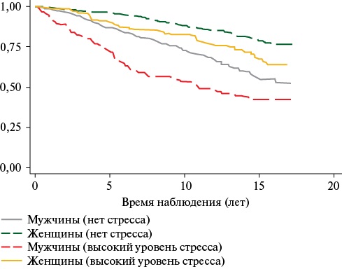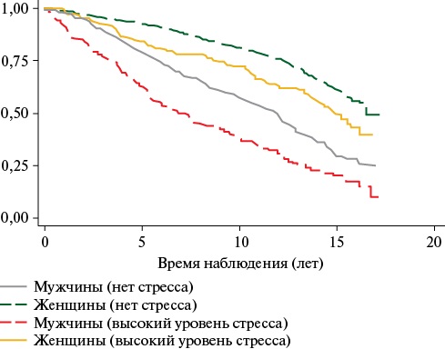 Рис. 3 Сердечно-сосудистая выживаемость мужчин и женщин старше трудоспособного возраста в зависимости от уровня стресса.