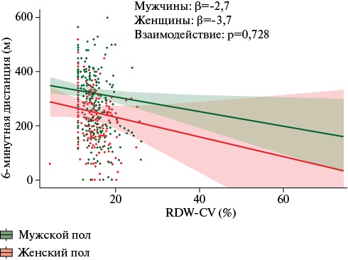 В настоящем исследовании при отдельном анализе у мужчин и женщин независимую ассоциацию с дистанцией 6МТХ у женщин продемонстрировали только возраст и тревожность/депрессия — тяжелое нарушение по самооценке пациентов. У мужчин независимую ассоциацию продемонстрировали также ФВ, RDW-CV и NT-proBNP. В то же время дополнительный анализ не выявил статистически значимого взаимодействия пола с этими факторами. Визуальный анализ графиков (рисунки 2-4) подтвердил отсутствие заметных различий в ассоциации между RDW-CV и полом, но выявил расхождение трендов для NT-proBNP у мужчин и женщин, и возможное расхождение при высоких значениях ФВ у мужчин. Эти наблюдения, несмотря на отсутствие статистической значимости для взаимодействия, могут указывать на потенциальные различия, связанные с полом, что требует дополнительного изучения на более крупных выборках.