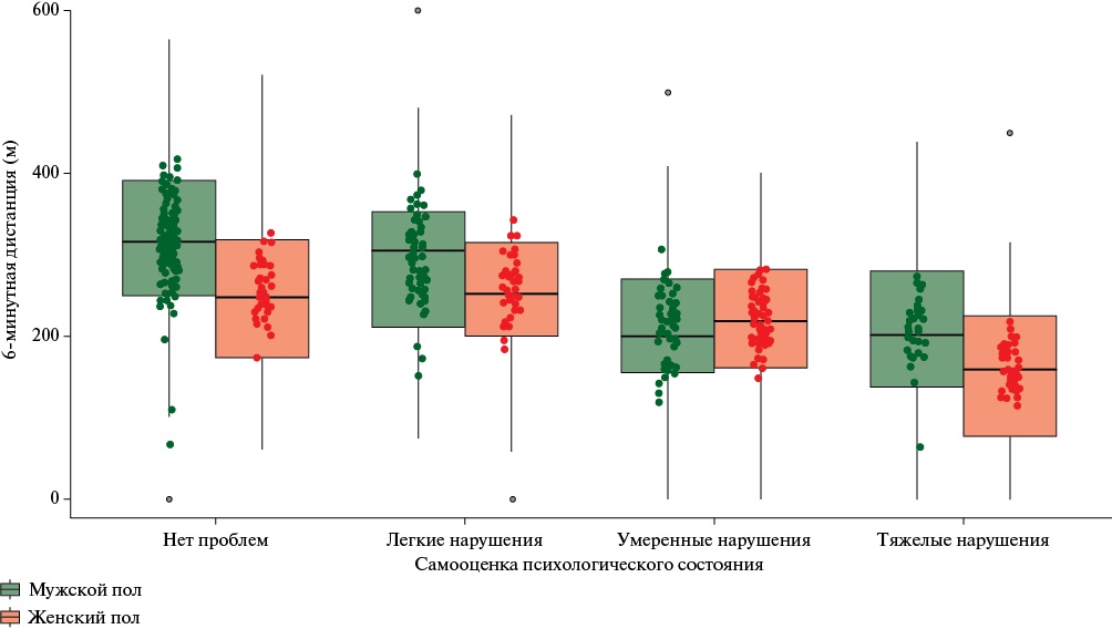 • Пол-модифицирующий эффект на ­дистанцию 6-минутного теста ходьбы показан только для самооценки психологического состояния у муж­чин, у которых даже умеренное нарушение пси­хологического состояния ассоциировано со сни­жением дистанции.